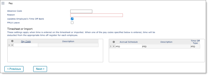 Enter a value that, when paid to employees, deducts the hours paid from the employee's time off bank for this absence code. The Pay Description displays. (These settings apply when users enter time on the timesheet or import them.) Note: You can only enter or select restricted pay codes (that is, pay codes assigned to the client in the Control tab on the Client Details form) when you select the Pay Code link. |