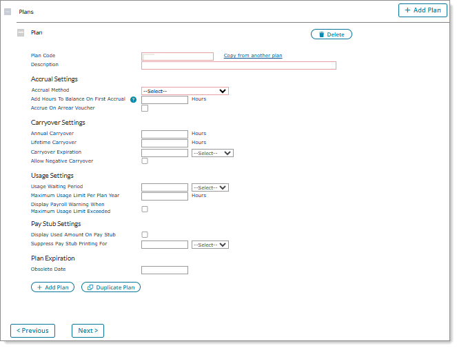 | a. | Click in the Accrual Schedule panel to open the Plans panel and complete those settings. |