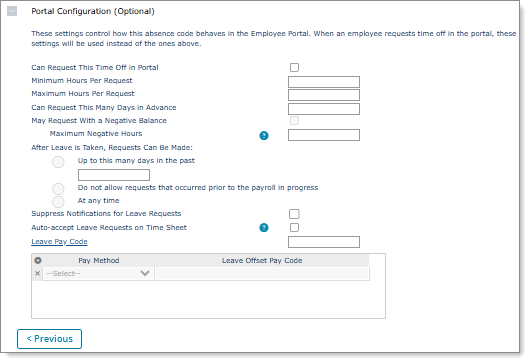 Use the Portal Configuration (Optional) panel to indicate whether an employee can submit a time off request in Employee Portal (EP). (All settings in this panel are optional.) For example: