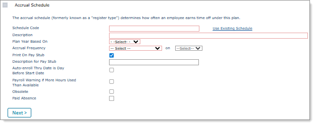 Enter a unique Schedule Code for this accrual schedule. For example, V for vacation, S for sick, or P for personal time. (Required.) Note: Click Create New Schedule to select a new accrual schedule for this time off type. |