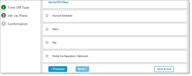 You can use the Set Up Plans form to create or update the employee time off accrual schedule, plan, pay, and portal configuration.