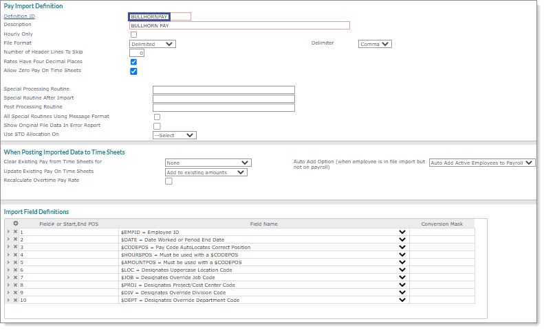 Before importing the configured .csv file, you must enable the BULLHORNPAY definition ID on the Pay Import Definition form. This format is used in conjunction with the Direct Pay Entry form to upload employee time. (Some imports already have this information pre-configured, but if not use the setup shown below.)